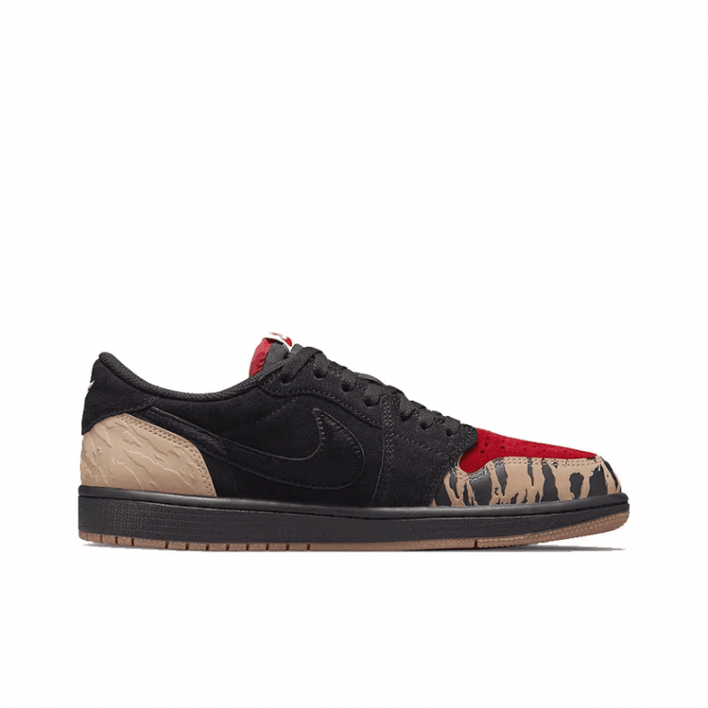 Оригінал SoleFly x Air Jordan 1 Low Retro OG SP ‘Everglades’, розроблений у партнерстві з бутиком кросівок у Маямі, оновлює класичний силует із стилізованим тваринним принтом. Візерунок нанесено на шкіряні накладки з коричневої шкіри на передній частині стопи та п’яті з тональним виконанням на останньому та двоколірним дизайном на першому. Інша частина верху складається з чорної замші на чверті панелі та малинової замші на носках. Ткані бирки Nike Air прикрашають кожен язичок, а на невідповідних виступах на п’яті на лівому черевику нанесено бренд SoleFly, а на правому – логотип Wings. Кросівки встановлені на чорну гумову проміжну підошву, посилену під ногами гумовою підошвою.