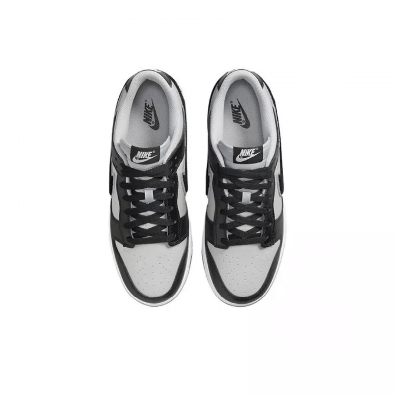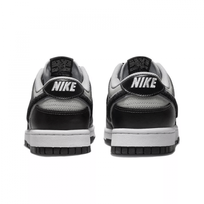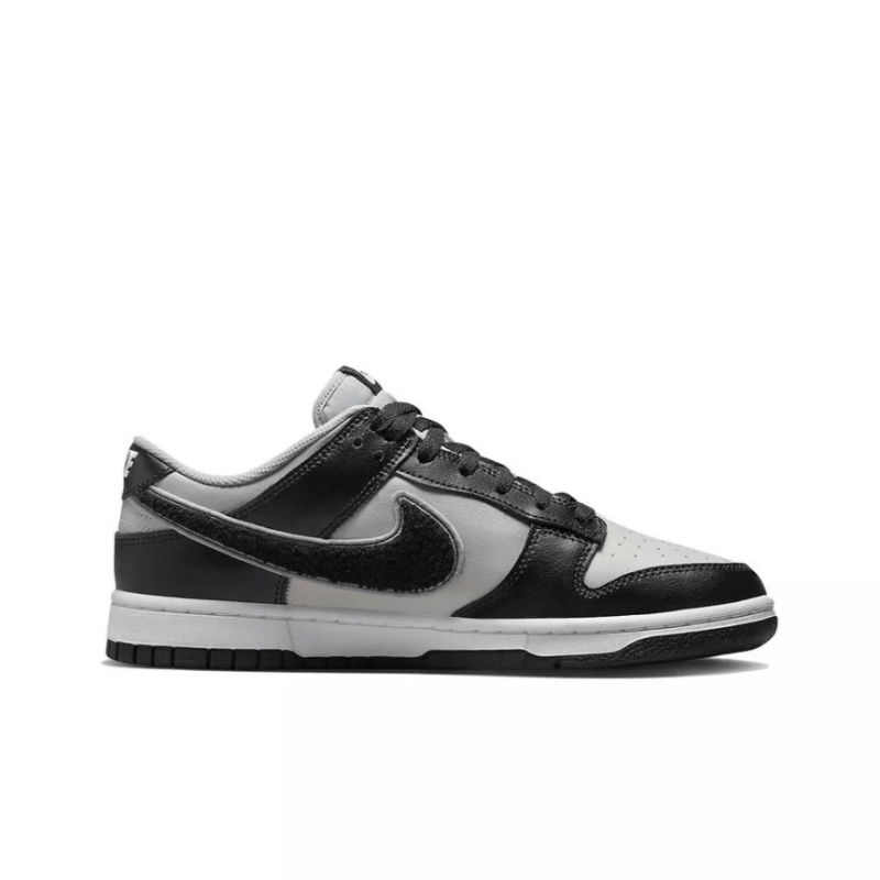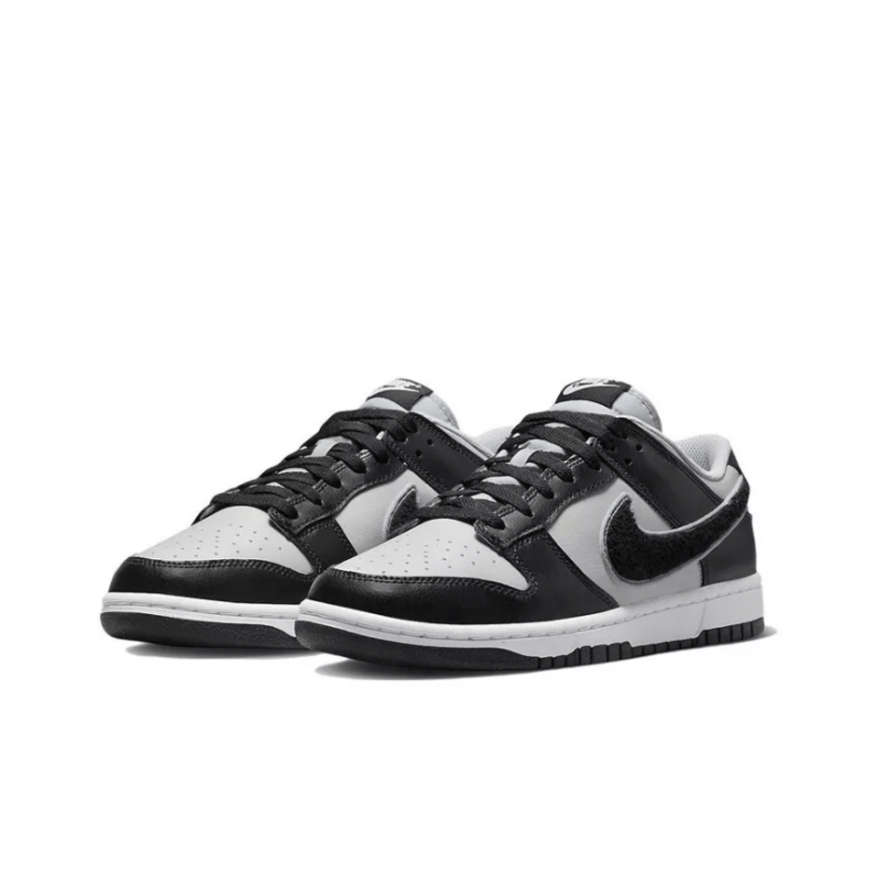 Nike Dunk Low «Black Grey Fog / Chenille Swoosh» демонструє оновлений дизайн, який передає університетське спортивне коріння взуття. Повністю шкіряний верх поєднує в собі матово-сіру основу з чорними накладками та ретро-галочку з розмитого чорного синелі. Тканий ярлик Nike прикрашає повітропроникний нейлоновий язичок, а вишитий напис Nike прикрашає чорну шкіряну петлю каблука. В основі кросівок лежить чітка біла проміжна підошва, підсилена міцною чорною гумовою підошвою.
