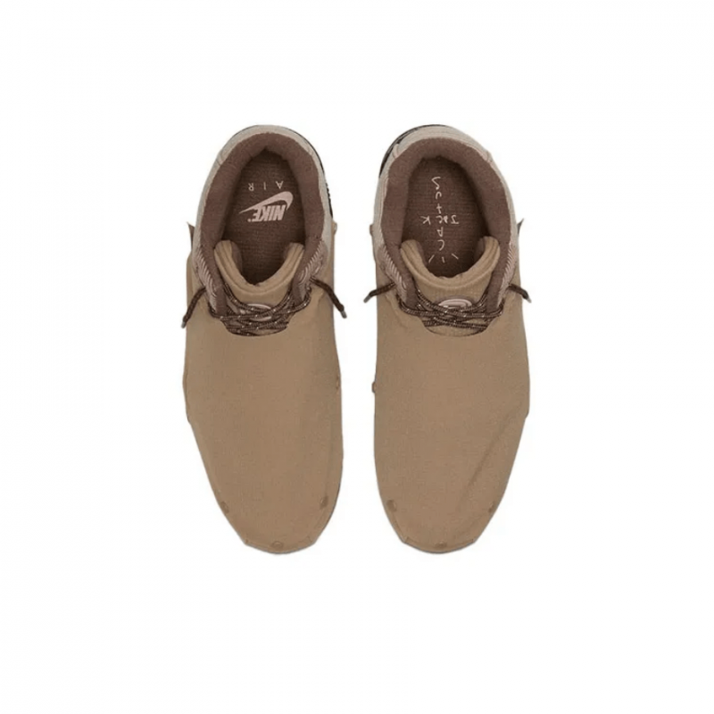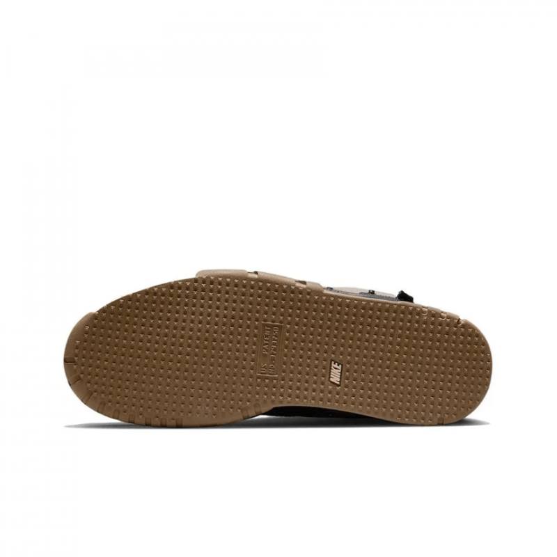 Кросівки Travis Scott x Nike Air Trainer 1 SP ‘Wheat’ (DR7515-200) представлені темною кольоровою гамою. Верх пари виготовлений переважно з вельвету. Якщо придивитися уважніше, можна помітити кілька защіпок у верхній частині. Коли ви купуєте пару, до верхньої частини за допомогою цих кнопок прикріплюється певний захисний шар. Ви можете вибрати качати пару з захистом або без.